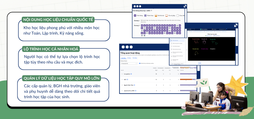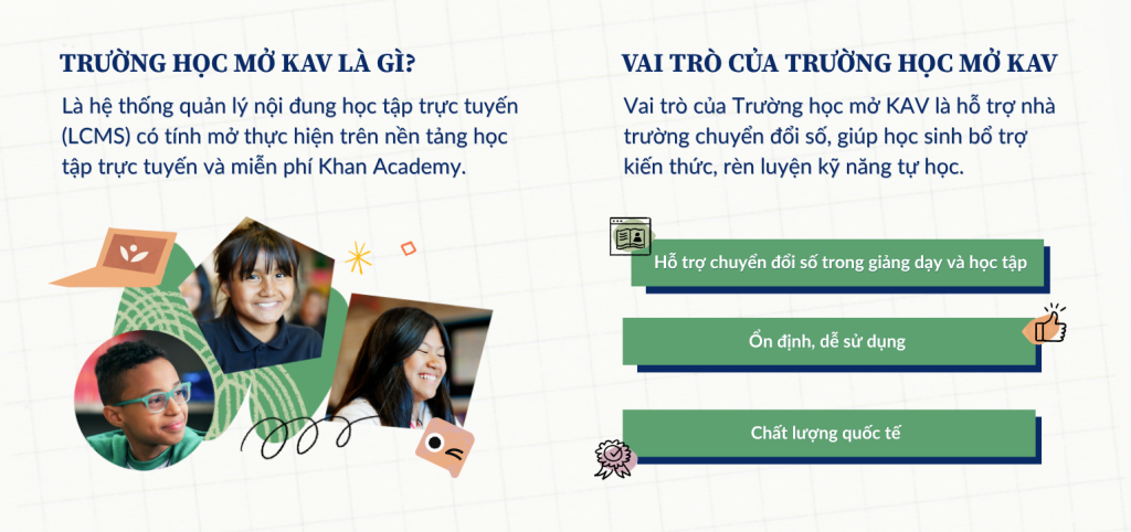 Là hệ thống quản lý nội dung học tập trực tuyến (LCMS) có tính mở thực hiện trên nền tảng học tập trực tuyến và miễn phí Khan Academy. Vai trò của Trường học mở KAV là hỗ trợ nhà trường chuyển đổi số, giúp học sinh bổ trợ kiến thức, rèn luyện kỹ năng tự học.