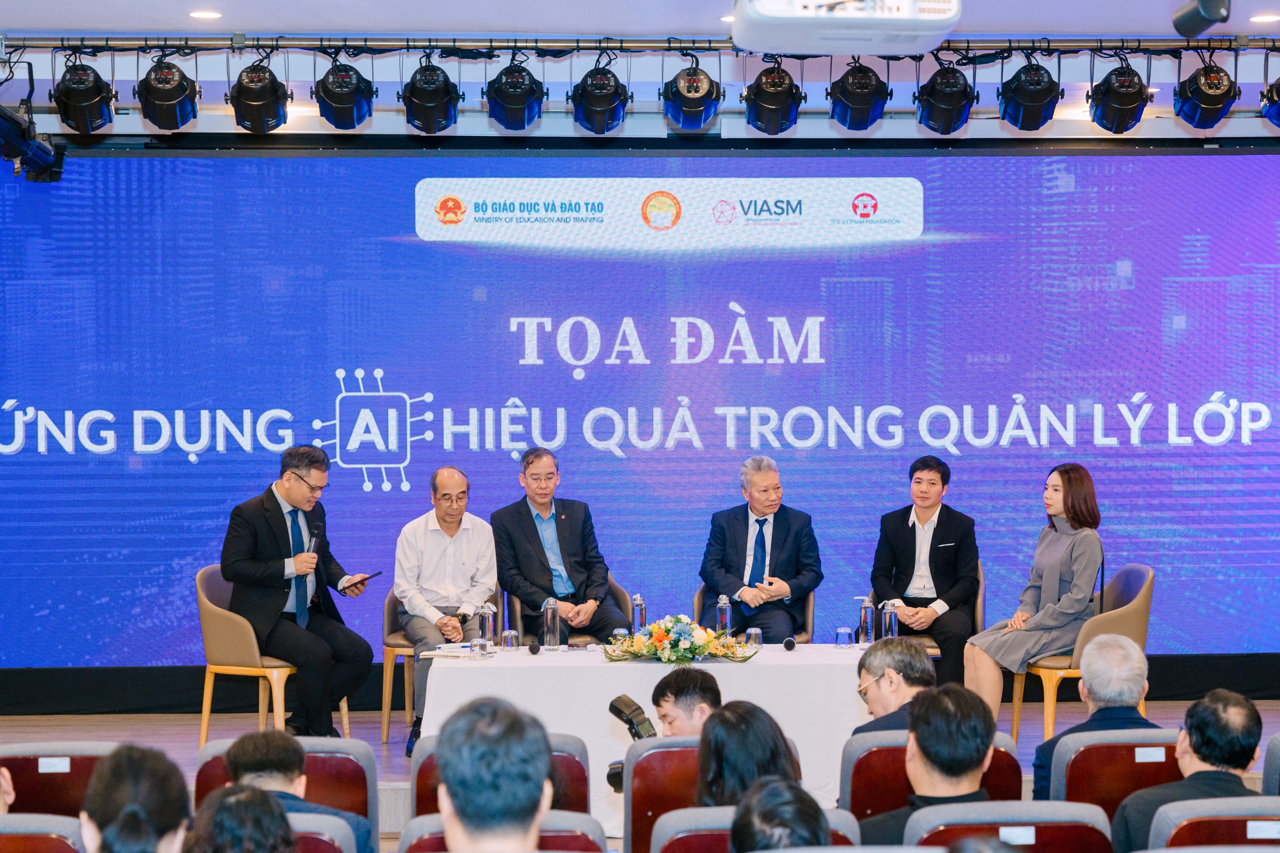 Bên cạnh đó, phiên tọa đàm “Ứng dụng AI hiệu quả trong quản lý lớp học” có sự tham gia của các chuyên gia và nhà quản lý giáo dục hàng đầu như GS.TSKH. Hồ Tú Bảo – Giám đốc Phòng thí nghiệm Khoa học Dữ liệu, VIASM; TS. Vũ Minh Đức – Cục trưởng Cục Nhà giáo và Cán bộ Quản lý Giáo dục; TS. Nguyễn Hồng Sơn – Phó Chủ tịch Hội Khuyến học Việt Nam; Thầy Đào Chí Mạnh – Hiệu trưởng Trường Tiểu học Hội Hợp B (Phú Thọ); ThS. Chu Hải Yến – Giáo viên Trường Trung học Cơ sở Ngoại ngữ, Trường Đại học Ngoại ngữ và TS. Đỗ Ngọc Minh – The Vietnam Foundation, điều phối tọa đàm.