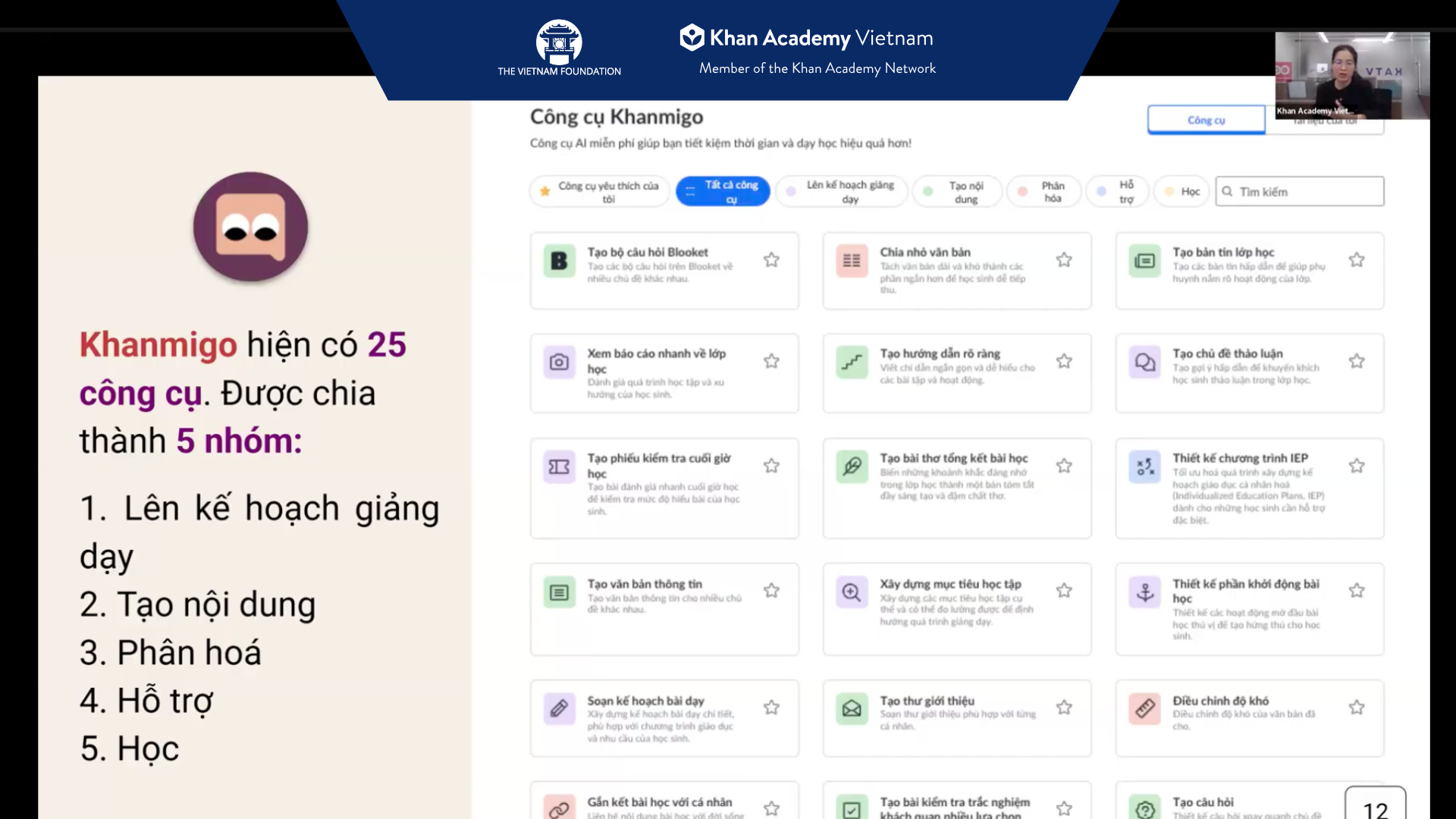 Tại phiên giới thiệu Khanmigo, đại diện Khan Academy Vietnam giới thiệu Khanmigo – trợ giảng AI dành cho giáo viên, hiện đã ra mắt phiên bản tiếng Việt và được cung cấp hoàn toàn miễn phí trong hệ sinh thái Trường học mở KAV. Khanmigo sẽ giúp giáo viên xây dựng kế hoạch bài dạy, thiết kế câu hỏi, phân hóa nhiệm vụ học tập và hỗ trợ đánh giá, góp phần giảm tải công việc và nâng cao hiệu quả dạy học trong bối cảnh chuyển đổi số giáo dục.